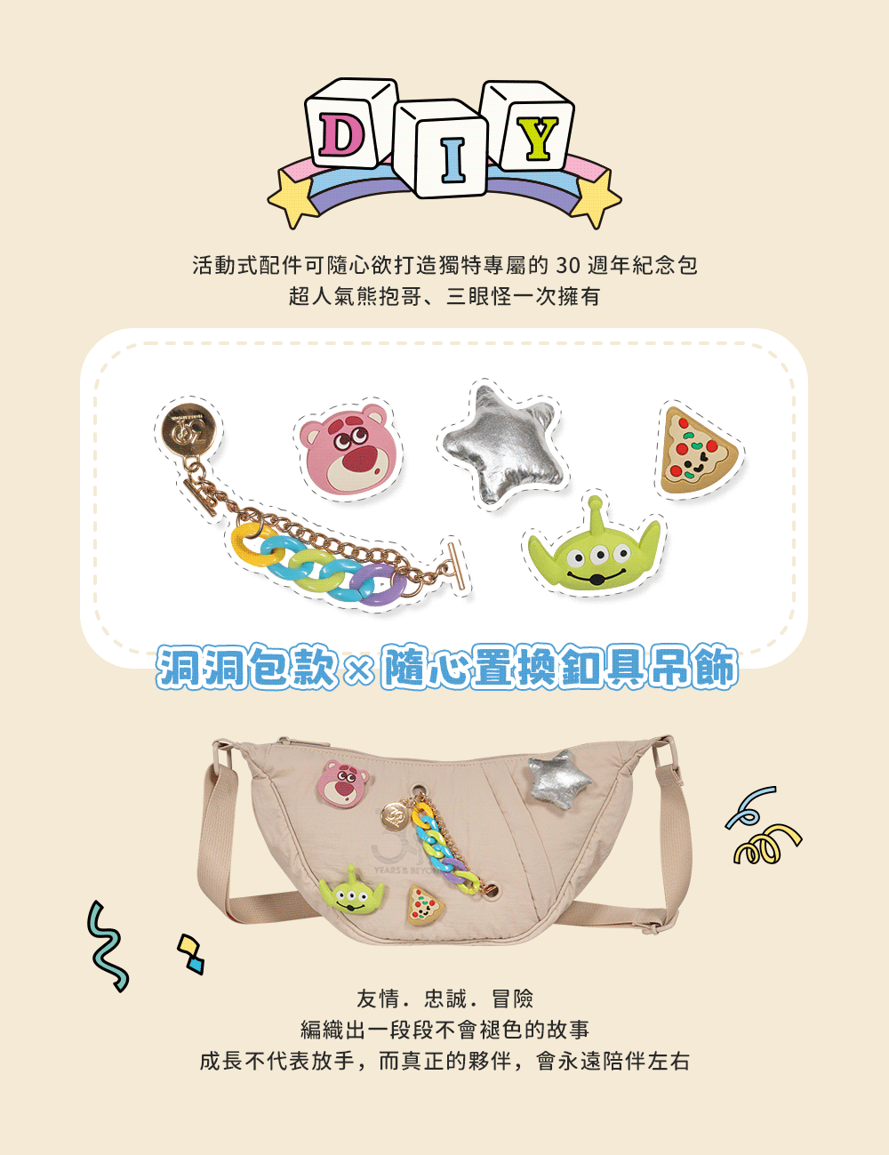 【正版DISNEY】玩具总动员30周年侧背包-米色 ❌原价RM205❌ 现在只需【RM159】 ☁️DIY趣味设计 ✅活动式配件可随心欲打造独特 🔥专属的30周年纪念包 ✅超人气熊抱哥、三眼怪一次拥有 ✅30周年金属小圆牌 玩具总动员30周年系列限定发售! 全系列以经典角色打造立体造型挂饰零钱包、率性风格休闲包款,每款都想一一收藏! 🇼🇸台湾代购 赶快PM我们下单🛒📲