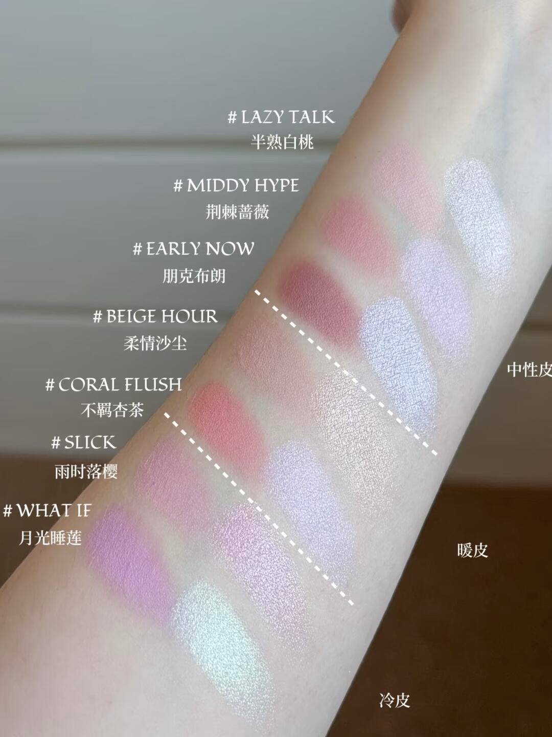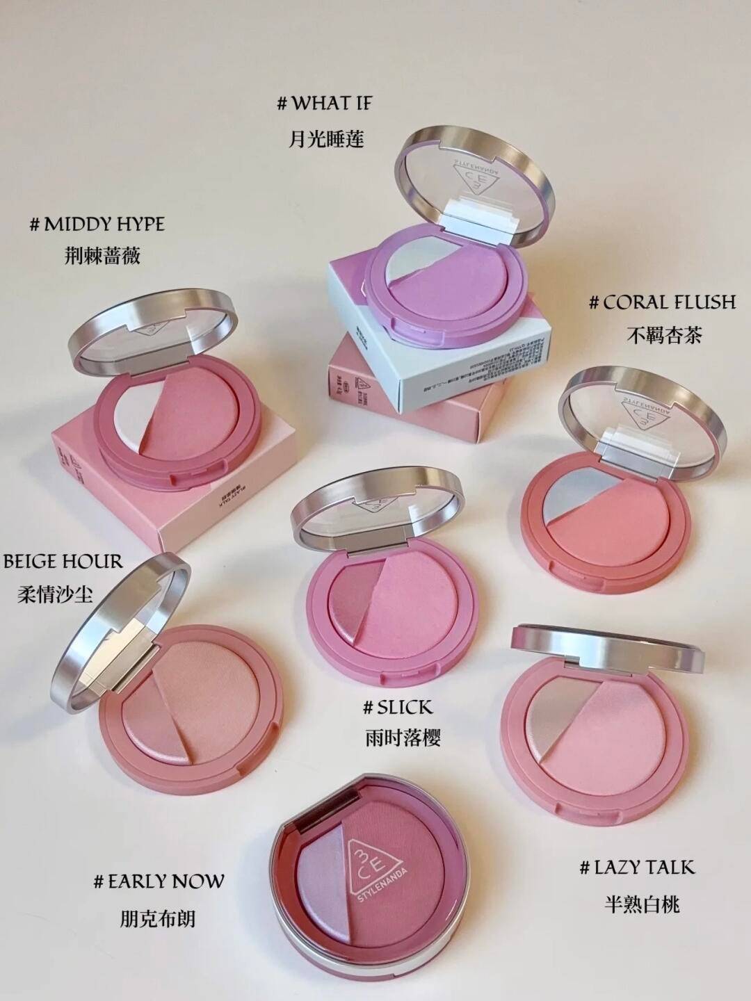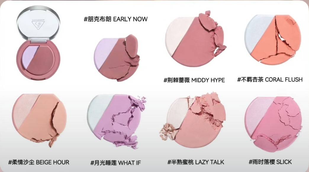 【 3CE Blushlighter 高光腮红盘 】 RM75 3CE推出全新「焕妆腮红盘」 🆕 哑光腮红+细腻高光,双质膏体!还是像跷跷板一样的盘面设计,腮红高光串不了一点! ✅ 生巧质地更贴妆,比干粉质地更加贴妆 ✅ 细腻柔焦填毛孔,肌肤更加细腻 ✅ 均匀上色不易飞粉,显色持久 🌼 CORAL FLUSH 不羁杏茶(适合暖皮) 元气活泼型的蜜瓜橘色,搭配通透紫银高光 🌼 LAZY TALK 半熟白桃 減龄又百搭的粉嫩白桃色,搭配冷调的香槟粉高光 🌼MIDDY HYPE 荆棘蔷薇(适合橄榄皮) 橄榄皮知性温柔的玫瑰豆沙色,搭配紫色偏光高光 🌼BEIGE HOUR 柔情沙尘(适合暖皮) 原生美人感的裸米咖色,搭配同色系高光 🌼EARLY NOW 朋克布朗 低调柔雾的木质玫瑰色,搭配粉紫高光 🌼SLICK 雨时落樱(适合橄榄皮) 俏皮可爱的冷调草莓奶油粉,搭配透粉高光 🌼WHAT IF月光睡莲 提气色的清冷调紫,搭配银色高光 使用方法 : 先高光,再腮红: 柔光焕亮塑轮廓 氛围腮红层叠晕染,打造清透水润好气色 先腮红,后高光: 缤纷颊彩,一触紧密贴肤 融光入妆,升级灵动氛围 单用腮红: 绯色上颊,透显原生气血感 轻松晕染不飞粉,新手0门槛,显色更持色