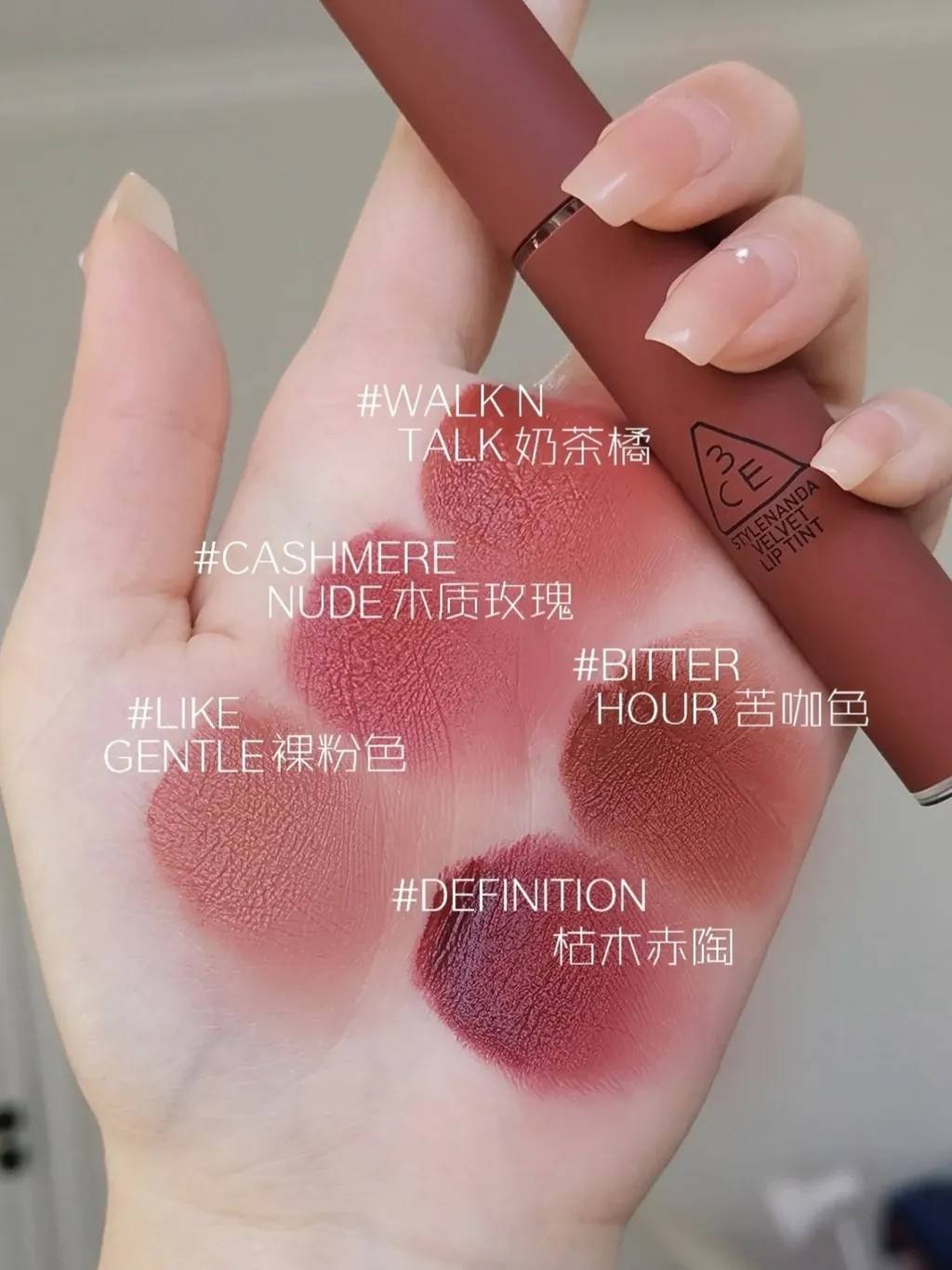 【 3CE Velvet Lip Tint 】RM59 🔥 每一个颜色都好看到让我微醺~闭着眼睛买都不会出错的!顏色真的是太美了!❤️ 不入手 实在对不起自己 😂😂😂 嘴巴干燥也没问题,这款涂起来就是美美的 款式选择 : 🌸CHILDLIKE 🌸BEST EVER 🌸PRIVATE 🌸DAFFODIL 🔥 🌸GOING RIGHT 🌸NEW NUDE 🌸PINK BREAK 🌸KNOW BETTER 🌸SPEAK UP 🔥 🌸THINK AGAIN 🌸BITTER HOUR 🔥 🌸CASHMERE NUDE 🌸DEFINITION 🔥 🌸LIKE GENTLE 🌸WALK N TALK 🌸TAUPE 🔥 3CE这系列的唇釉,除了颜色深得我心之外,还有它的质地!天鹅绒一样的柔雾哑光质感,跟阿玛尼红管很像。一样的丝滑细腻,虽然是哑光的但一点都不会觉得拔干,而且很好涂!就像抹奶油一样~ 😍 完美!挑不出毛病,已被列入最爱哑光唇釉系列名单! 💗
