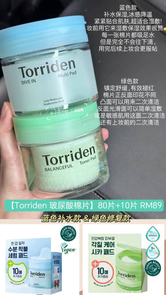 【Torriden 棉片】80片+10片 RM89 🔥🔥 💙蓝色-玻尿酸 3秒补水→ 5D-复合透明质酸(Hyacross) 极致5重保湿成份。全方位5重保湿,达至层层补水、锁水、长效保湿滋润效果,肌肤即时水润富有弹性! ✅日常急救缺水肌,简单方便,在干燥地方轻敷 ✅ 薄薄的棉片牢牢紧贴肌肤,很好渗透 ✅半月形计敷在眼下鼻位方便舒适 ✅快速冷却镇静,有效舒缓敏感发红发热状况 ✅满满透明质酸保湿精华,上脸水感持久超水 润、清爽补水、不黏腻 ✅ 所有肌肤适用,敏感肌也适用,缺水肌、干敏 肌,适合发炎 💚绿色-积雪草 成份是纯净简单低敏,无有害成份,主要成份以透明质酸和多种的积雪草提取物为主,调节水油平衡、泛红、痘痘,清爽保湿,适合油肌、混油、痘痘敏感肌使用! ✅对痘痘、镇静舒敏,降红很有效! ✅也可用于补妆时/胸背部油脂分泌较多的肌肤轻轻擦拭 ✅双面纹理大尺寸6.5cm棉片 ✅低敏弱酸LHA PHA,温和控油去角质 ✅清爽不刺激 赶快PM我们下单📲📲