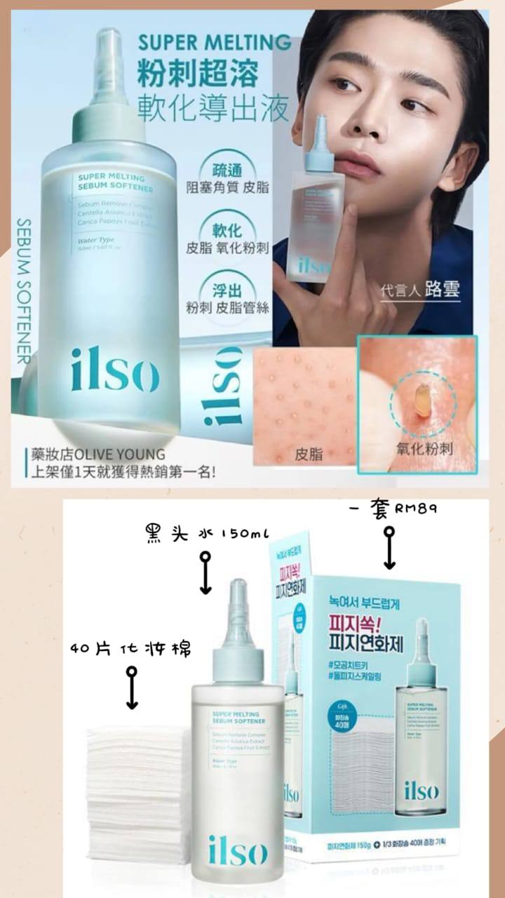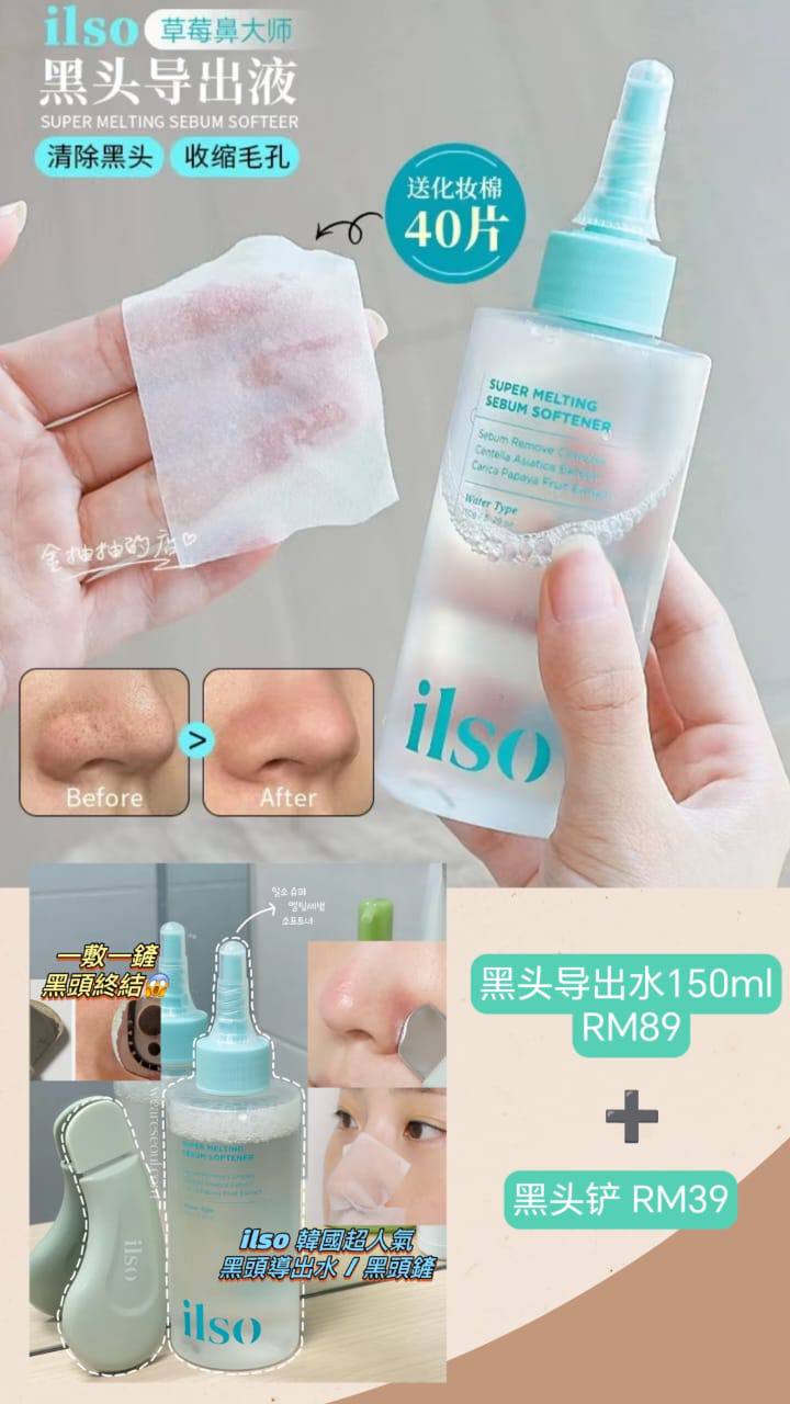 【ilso 黑头导出液】150g + 40棉片 RM89 这支功效超神奇!韩国INS热爆推荐倒化妆绵敷上10-15分钟黑头皮脂浮出水面!如果没有好好排出就会变硬然后氧化最后形成黑头粉刺‼️ 产品特点: 🌸去黑头粉刺 🌸帮助软化皮脂 🌸洁净肌肤效果 🌸深层清洁毛孔 ✅使用方法:洁面后,倒湿化妆绵敷于鼻头、下巴、额头、面颊位等黑头集中位置10-15分钟后清水冲洗~ 📍『使用它们家的黑头铲来清理粉刺 效果会更好哟』 赶快PM我们下单吧📲📲