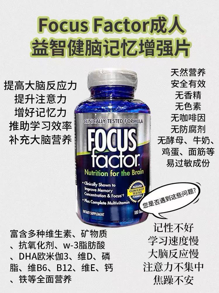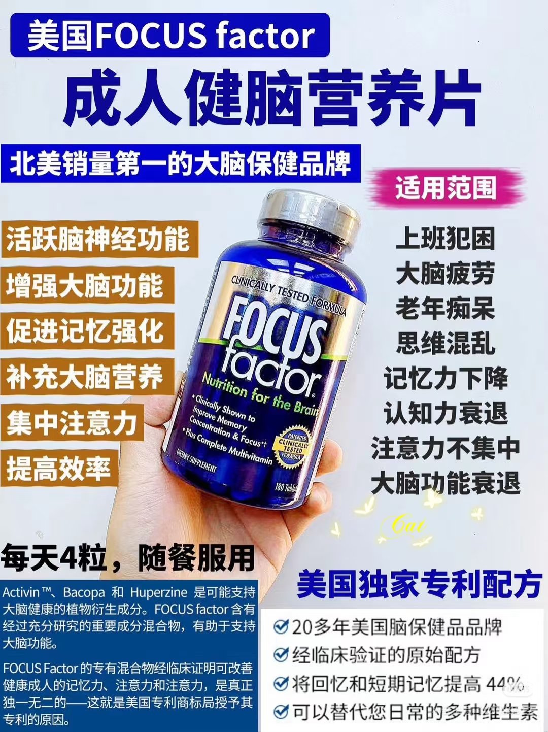 🇺🇸Focus Factor 成人健脑营养片180粒 RM179✅ 🔬临床显示:可改善记忆力、注意力、及专注力 是美国销量第一的大脑保健品品牌!为大脑补充营养,提高大脑记忆力;提高大脑系统反应的灵敏和正确;强化精力和注意力的集中;提高学习速度和效果;提高心理素质。备考学生、上班开会、科研人员、老年人都适合。每日随早餐服用4粒,6周为有效见证 ☁️对改善老年痴呆也有好处!压力山大的高考生也可以试试哦!!提高学习效率,为大脑补充营养 🇺🇸美国正品亲自代购 赶快PM我们下单📲