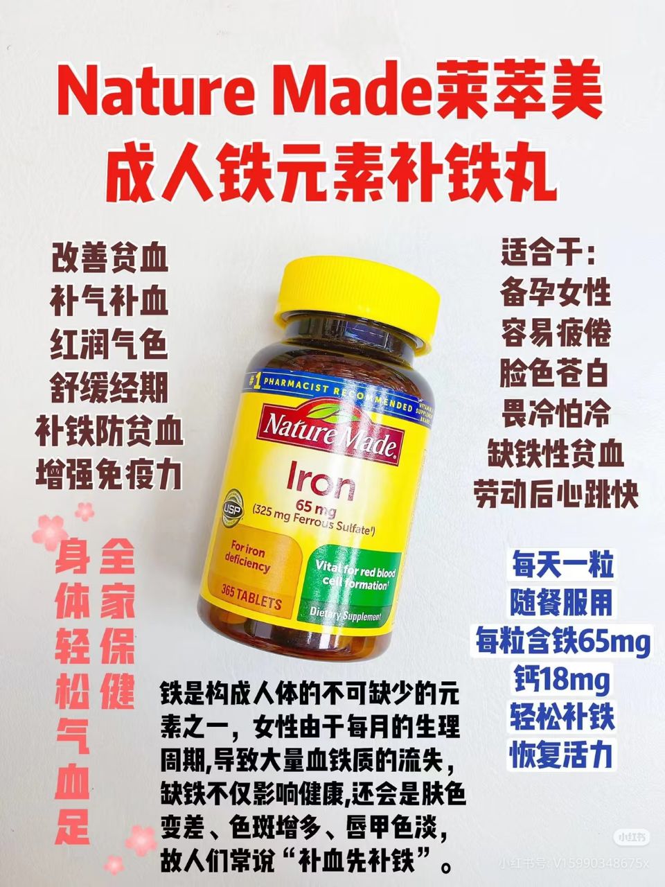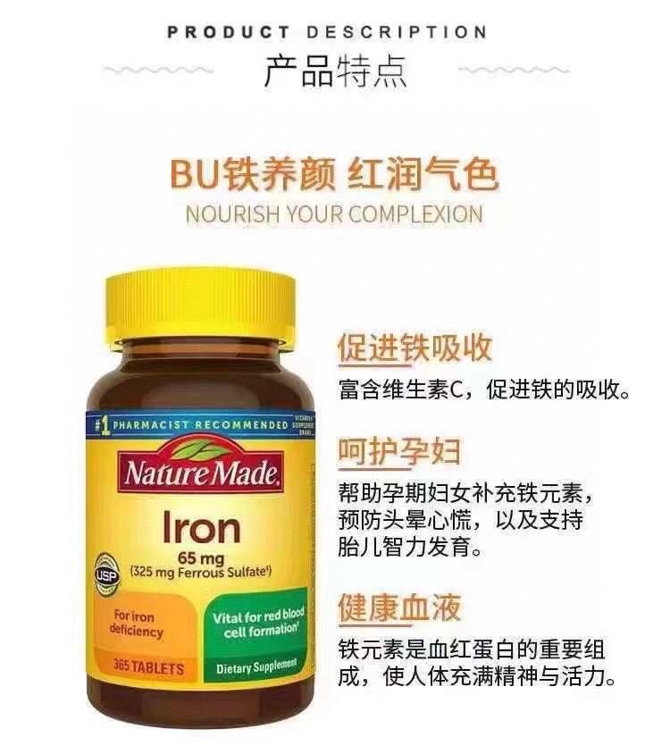 🇺🇸Nature Made Iron 一瓶365粒 RM130✅ 🌟nature made 铁元素:贫血!贫血!贫血!铁元素在身体中必不可少,美国医生经常推荐家庭常备铁元素保健品,告别贫血~ 大姨妈期间全身无力,酸软,吃这个效果极好,女人和尤其准备怀孕的女人特别需要补充铁质!很多宝宝出生后缺铁,那是因为怀孕时候的准妈妈们先缺铁啦!只要你特别容易疲劳,脸色苍白,寒冷手脚容易冰凉都适合补充铁质!! 每一粒含铁65mg ,一瓶365粒,一瓶可以吃一年噢❗️ 🇺🇸美国代购中 赶快PM我们下单询问📲📲