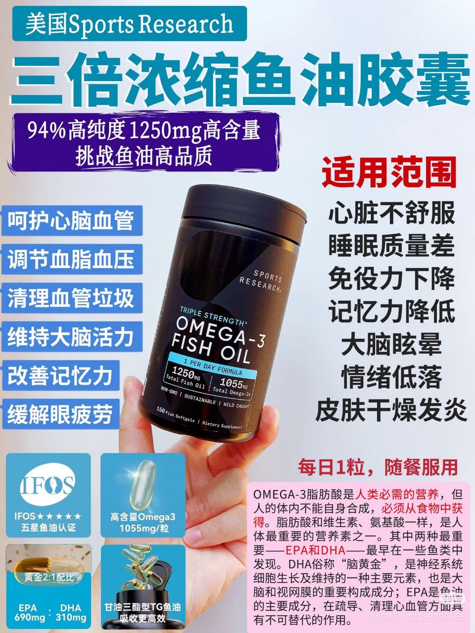 如果你在找高浓度的 鱼油 那么记得入手这款🔥 话说这款常常断货 我在架子上也看到不多🤣🤣 🇺🇸Sports Research野生3倍浓缩鱼油胶囊150粒装 RM179✅ 每粒含野生鱼油1250mg,欧米茄1040mg,685mgEPA, 310mg DHA 野生浓缩鱼油胶囊150粒装🔥分子蒸留和全化工艺从野生鱼中提取的高浓度鱼油,适合中老年和亚健康人群,每天饭后一粒💪🏻!