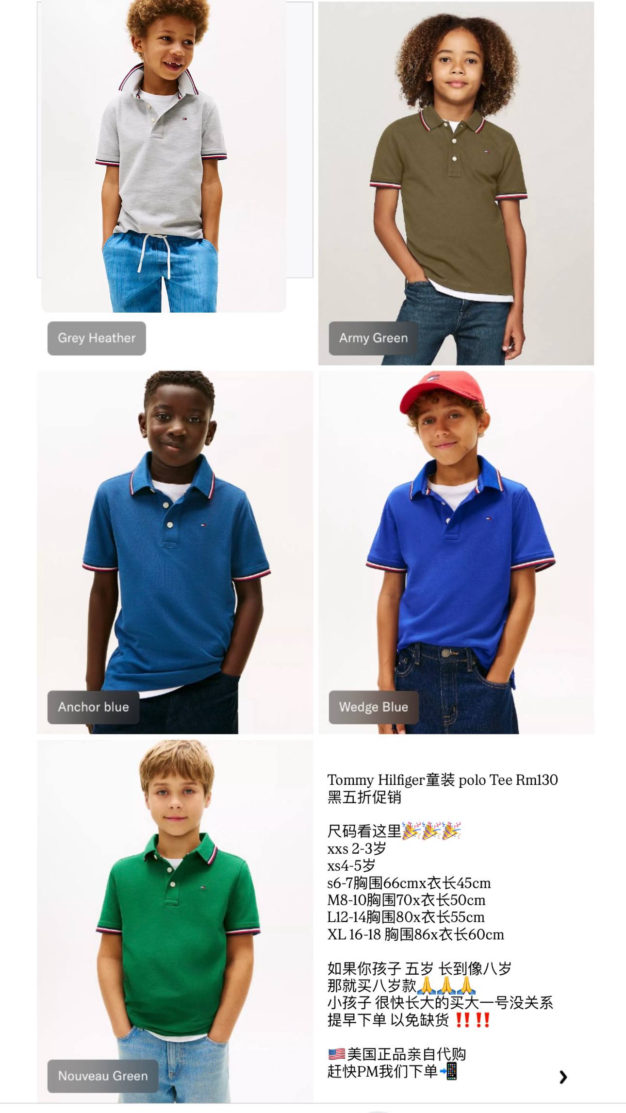 Tommy Hilfiger童装 polo Tee Rm130 黑五折促销 尺码看这里🎉🎉🎉 xxs 2-3岁 xs4-5岁 s6-7胸围66cmx衣长45cm M8-10胸围70x衣长50cm L12-14胸围80x衣长55cm XL 16-18 胸围86x衣长60cm 如果你孩子 五岁 长到像八岁 那就买八岁款🙏🙏🙏 小孩子 很快长大的买大一号没关系 提早下单 以免缺货 ‼️‼️ 🇺🇸美国正品亲自代购 赶快PM我们下单📲