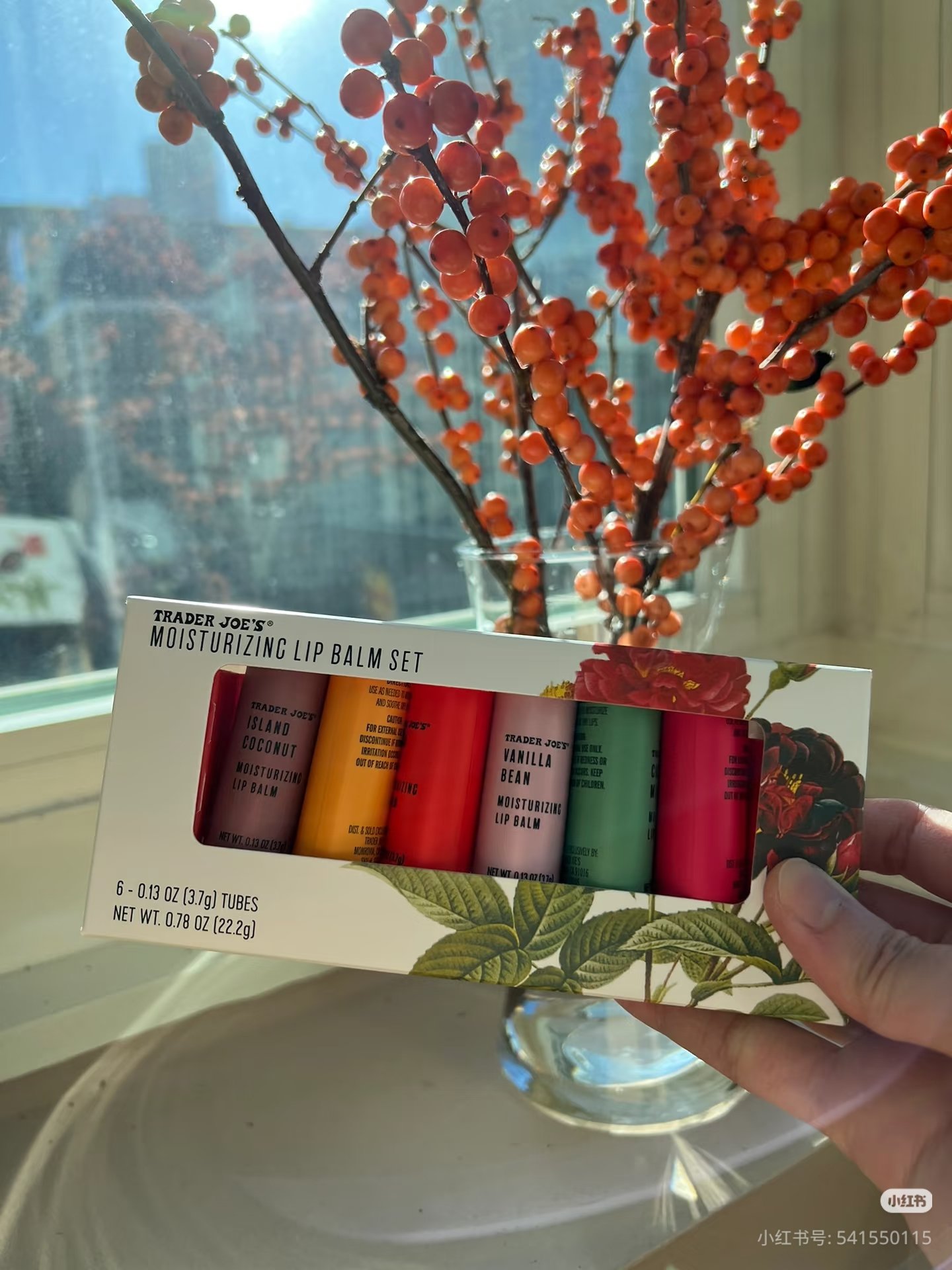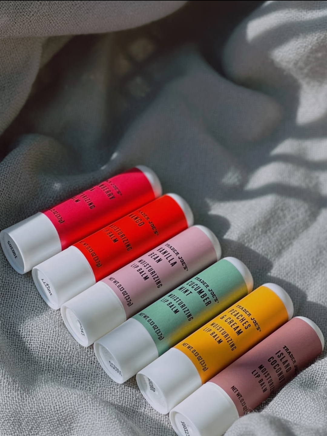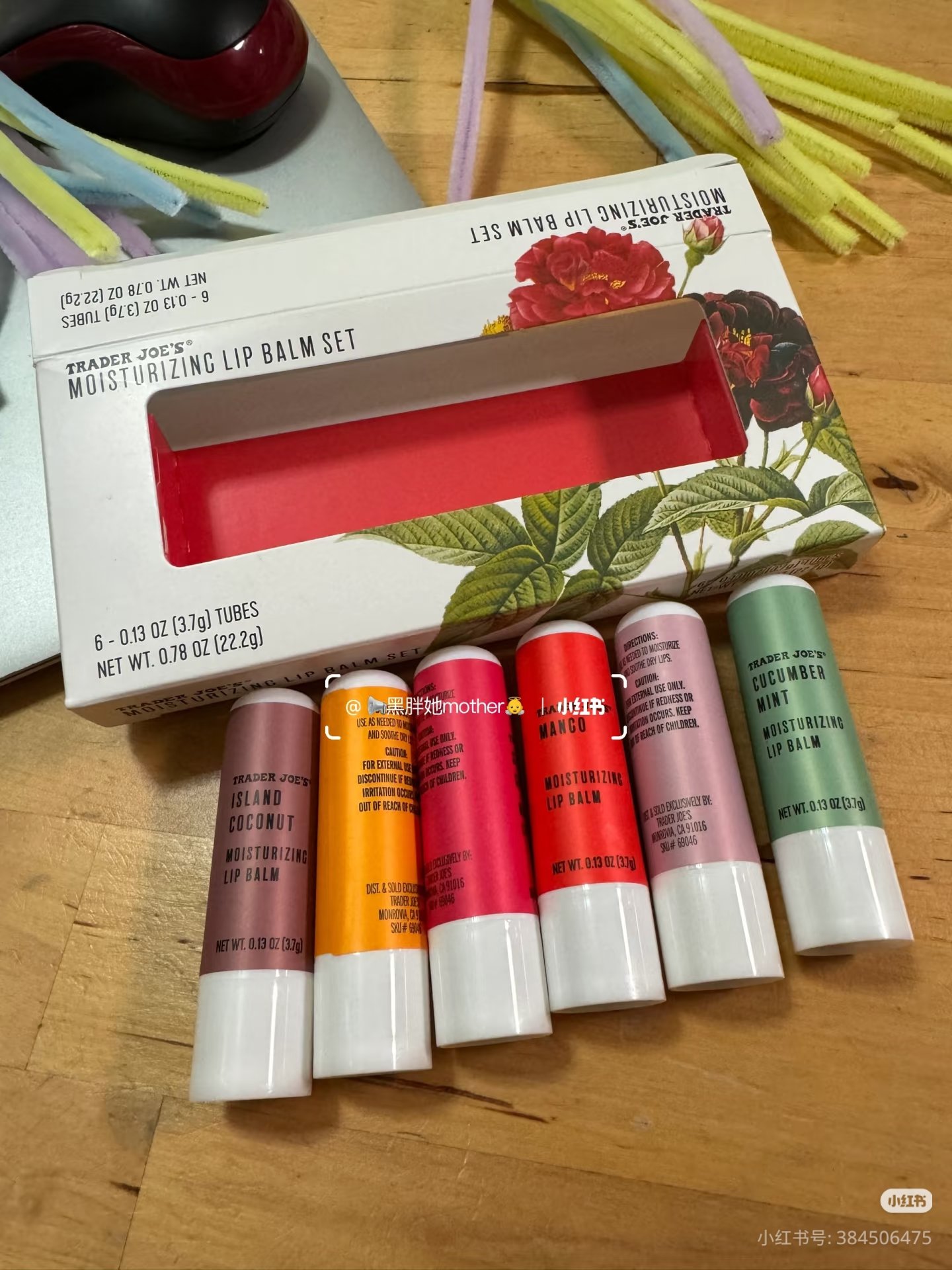 🇺🇸Trade Joe's润唇膏可以冲 RM49 价格便宜量又足,谁能拒绝😍 每种味道都是那种清香,没有下头的工业香,上嘴非常滋润,价格便宜量又足 推荐👍🏻 3.7g×6支,6种口味 黄瓜薄荷🍃 岛屿椰子🥥 桃子与奶油🍑 草莓鳄梨🍓 芒果🥭 香草🌿 成分简单,包括,椰子油、蜂蜡、蓖麻油、霍霍巴油、香豆素、生育酚(维生素E)、向日葵籽油、可可豆(可可)籽黄油、乳木果油、芦荟提取物