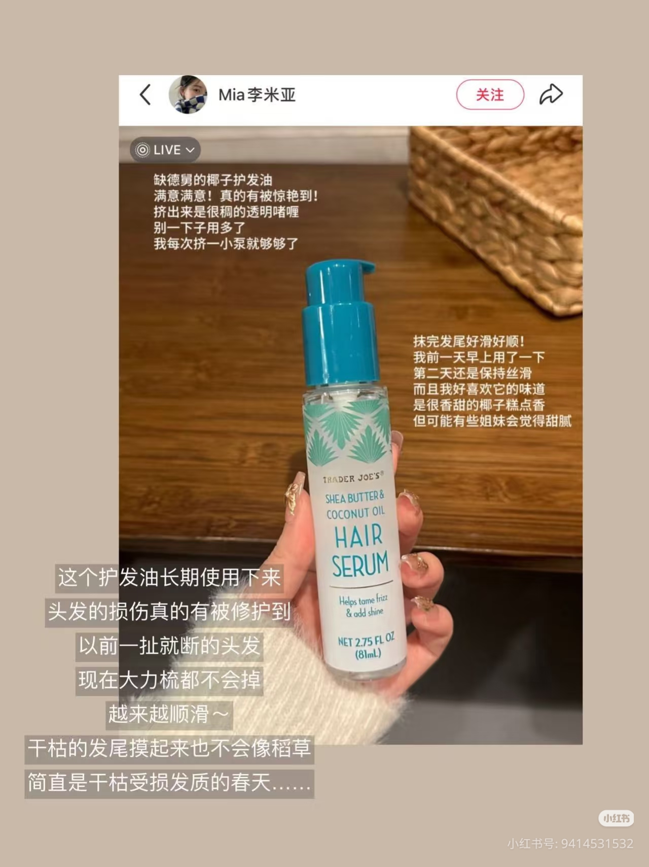 Trader Joe’s 超好用椰子发油 Rm49 🌟有机木果椰子油深层护发油81ml 和护发膜相同有清爽椰子香 干瀑发时都可以使用✔️ 可以在吹发前使用,也可以于吹干后抹 可修复受损或干臊发质