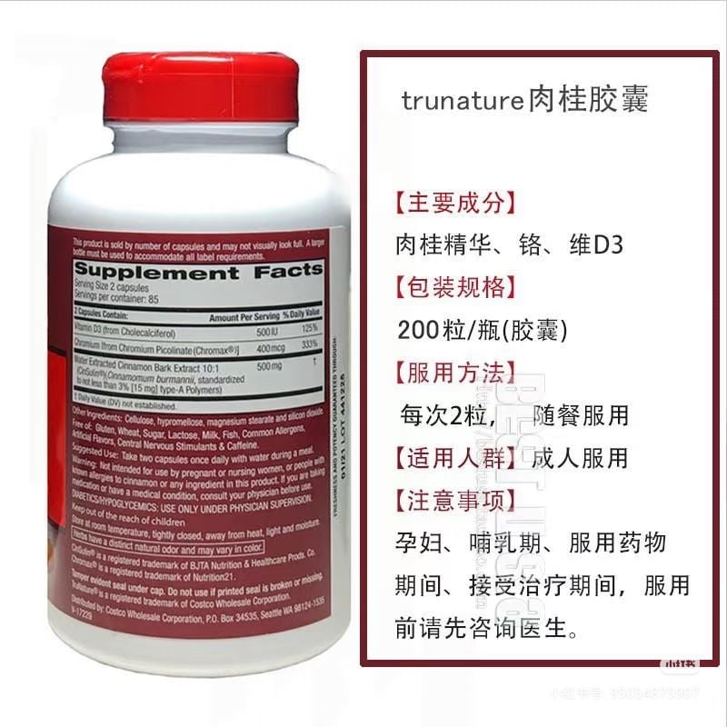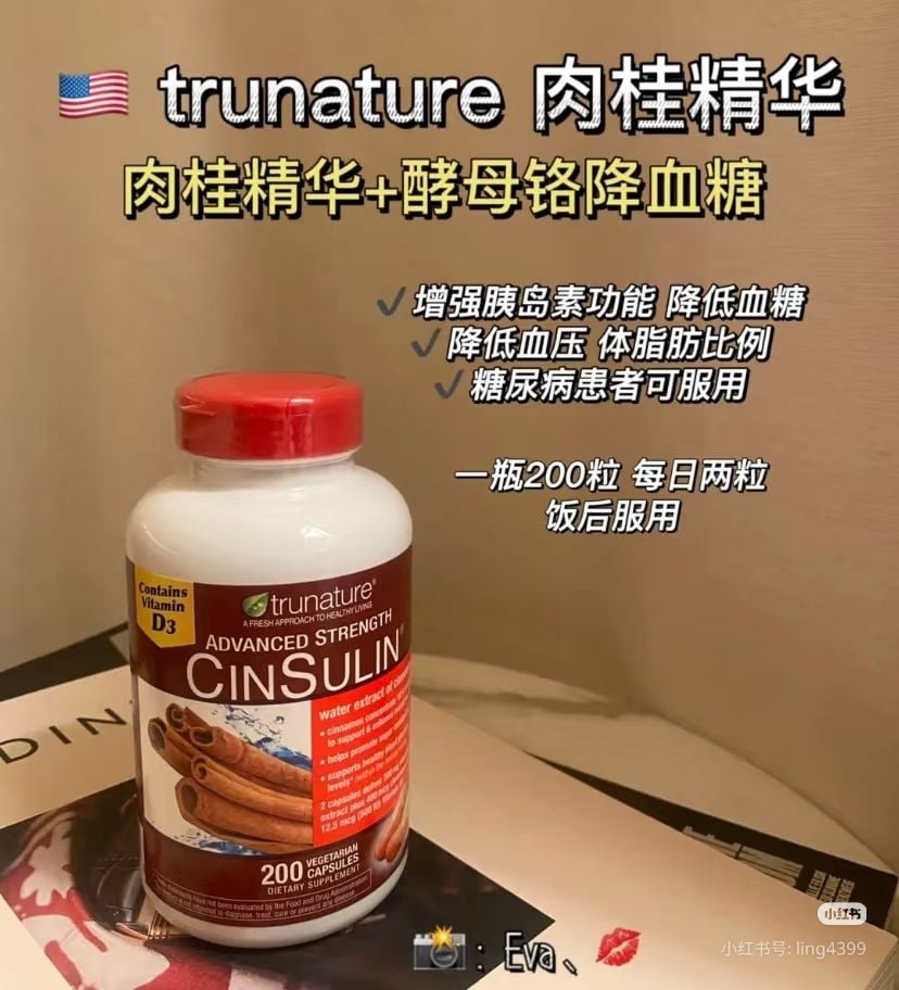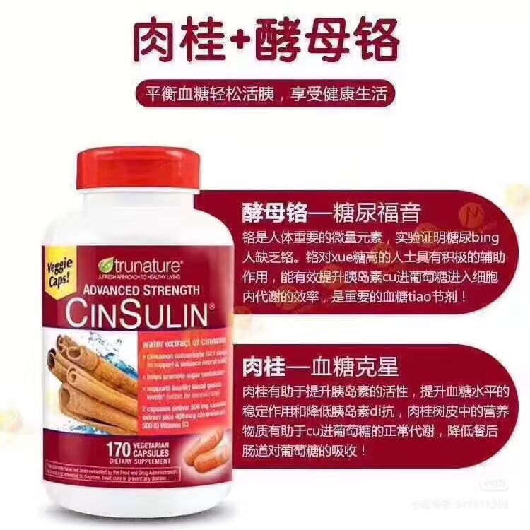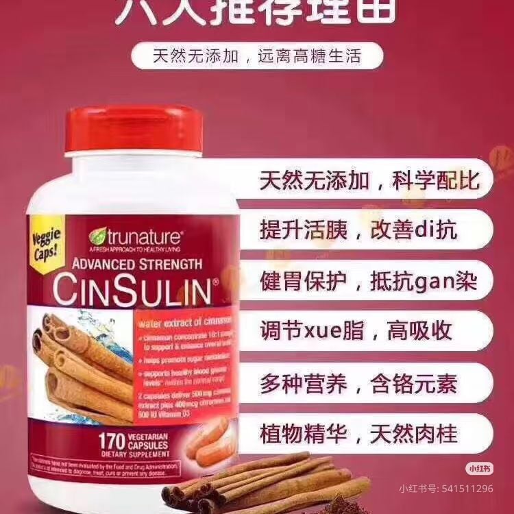预防糖尿病,增强胰岛素活性👉高血糖患者的福音 🇺🇸TruNature CinSulin RM160✅ 被认为是最纯粹的、最安全、最有效的降血糖保健品。可增强胰岛素活性,控制血糖。CinSulin是通过专利水平提取提供的唯一的肉桂TruNature品牌 170粒,每天两粒,可于晚饭后服用,用水吞服。一瓶为将近三个月的量 🇺🇸美国正品亲自代购 赶快PM我们下单📲
