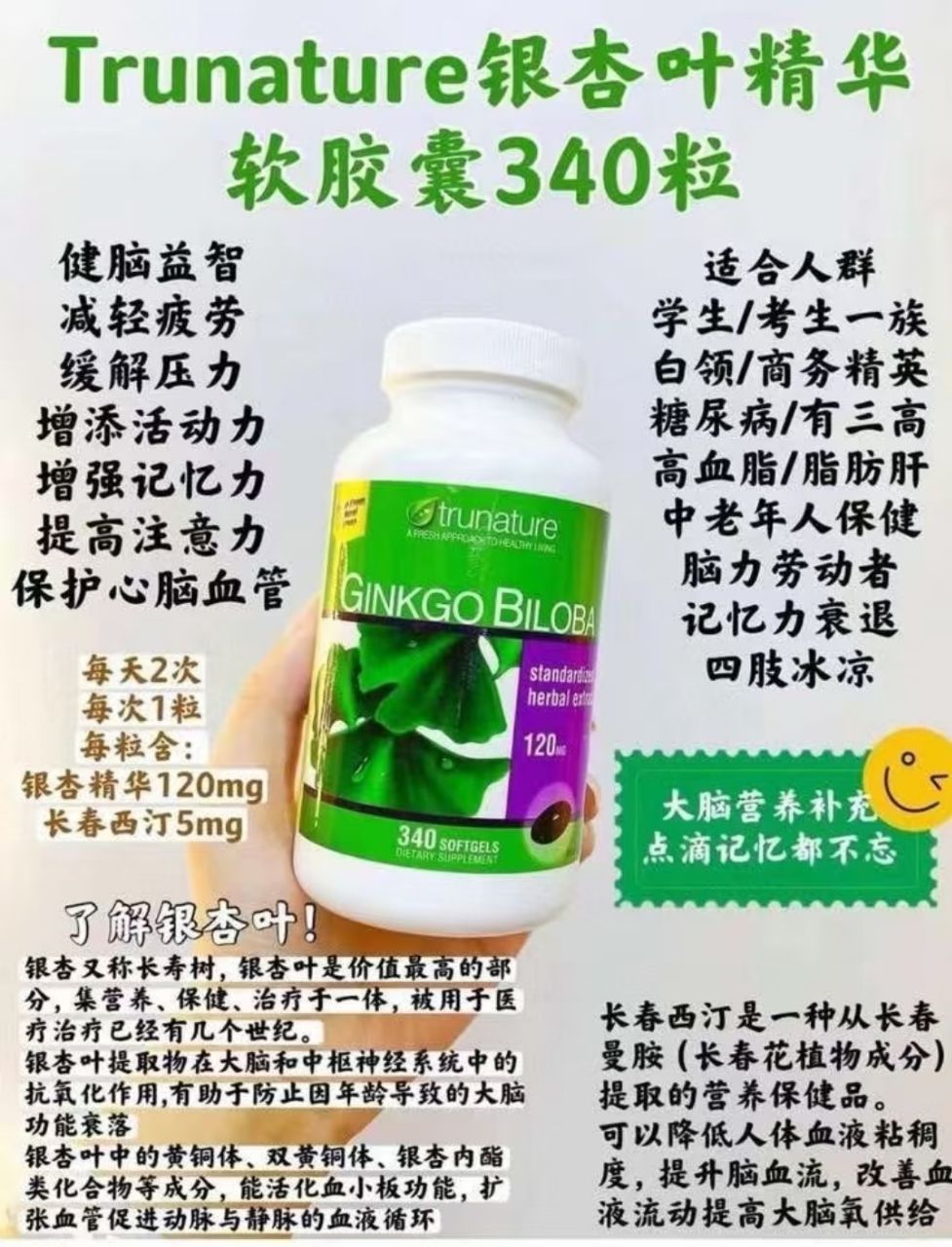 🇺🇸Trunature/Ginkgo Biloba成人银杏精华长春西汀120mg 300粒 RM130✅ 银杏有很多功能,可以降血压,呵护心脏大脑健康,增强记忆,每日两次,每次一粒,饭时服用✔️ 降血压💚健脑防止老年痴呆🌵促进血液循环,预防中风;降低血液黏度;☘✨改善末梢循环障碍所导致的症状,耳鸣、晕眩等症状🚴使硬化的血管恢复弹力,👍🏻预防动脉硬化、高血压等;改善早期糖尿病☘✨改善肩膀酸痛,眼睛疲劳 手脚麻痹及冰冷💁🏻 🇺🇸美国正品亲自代购 赶快PM我们下单📲