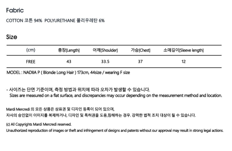 🇰🇷Mardi 贴身短款皱菊上衣 CROPPED TSHIRT FLOWERMARDI RM135 颜色: LIGHTBEIGE GREEN 浅米绿色 BLACK MINT 黑薄荷 NAVY TANGERINE 海军蓝橘色 CHARCOAL PINK 炭灰粉 GREY IVORY 灰色象牙白 CREAM NAVY 奶油海军蓝 BLACK IVORY 黑象牙白 尺码:FREESIZE 长度43 肩宽33.5 胸围74 袖长12 Mardi 🇰🇷小众品牌~ 追星女孩为爱豆同款冲它,文艺青年爱它的书卷气,就连穿搭博主都靠它打造“看起来很有钱”的effortless造型~